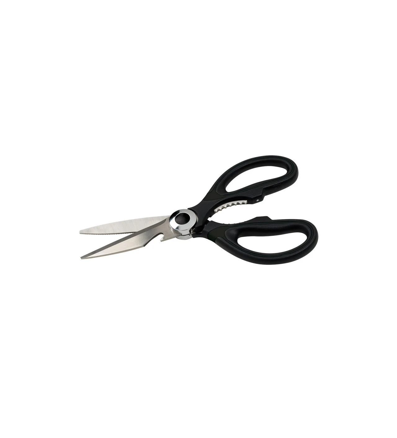 Las hojas dentadas de las tijeras de acero inoxidable ofrecen un mejor agarre al cortar los ingredientes y facilitan la tarea. Su borde dentado central es útil para desenroscar una botella o abrir tarros un poco duros.