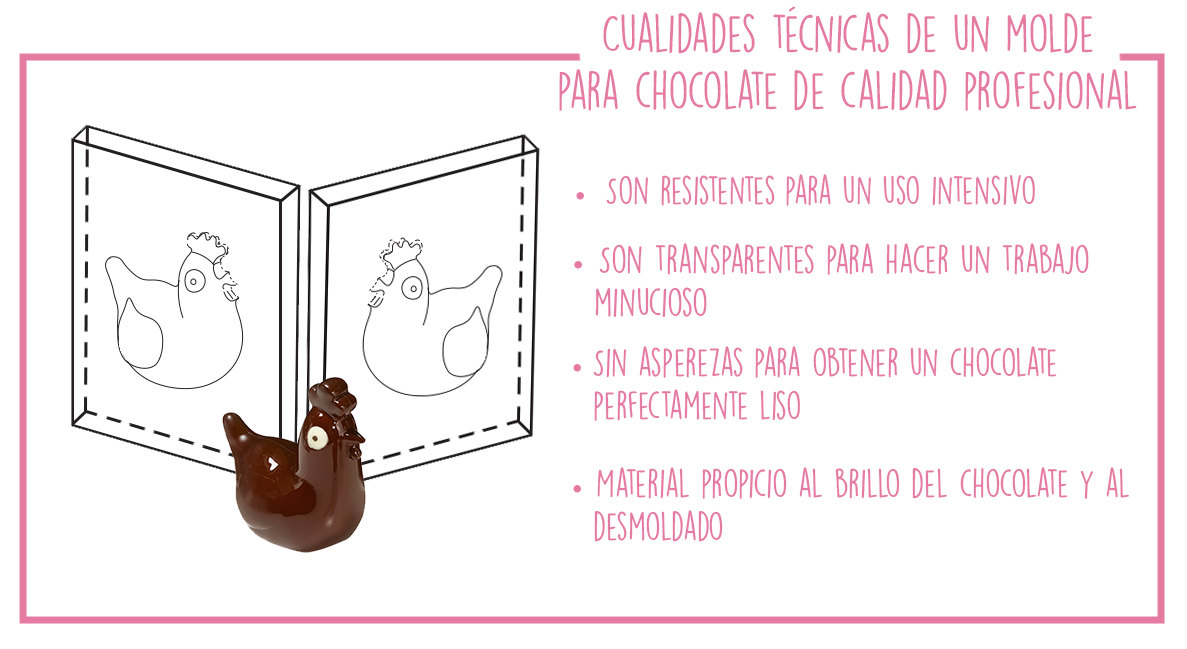 Así que las cualidades de estos moldes para chocolate influyen en el resultado final de tus creaciones. Un experto reconocerá un chocolate hecho en un molde de chocolate de calidad profesional. En efecto, las cortezas y los moldeados que se producen con este material son perfectos, lisos, brillantes y con un montaje impecable. Y aunque obviamente la técnica no es ajena a este resultado, los moldes para chocolate son una verdadera ayuda para esta destreza técnica.