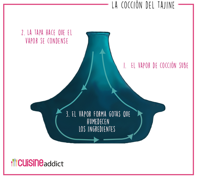 La tapa tiene una forma distintiva que ayuda a encapsular el vapor de la cocción, este sube hasta la punta, se condensa en la tapa e hidrata tus platos con las gotas que caen. De esta manera, los sabores se mezclan y los ingredientes se cuecen, utilizando poca agua o grasa.